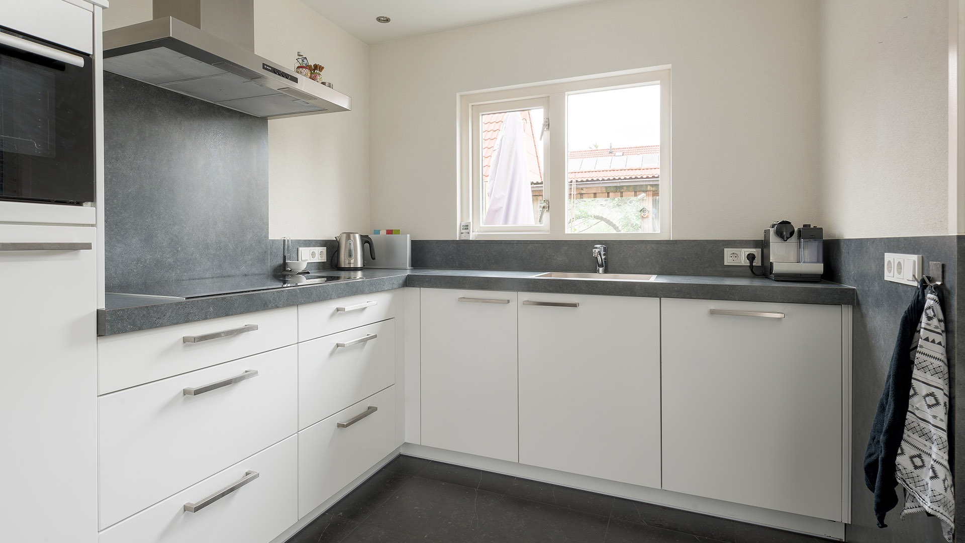 In dit woonhuis in Best werd de bestaande apparatuur opnieuw gebruikt in de nieuwe keuken. Materiaal: spuitwerk mdf fronten en HPL werkblad.